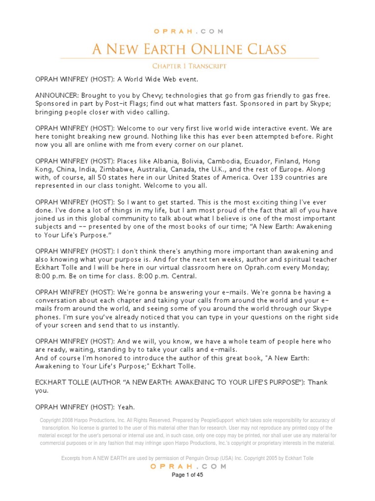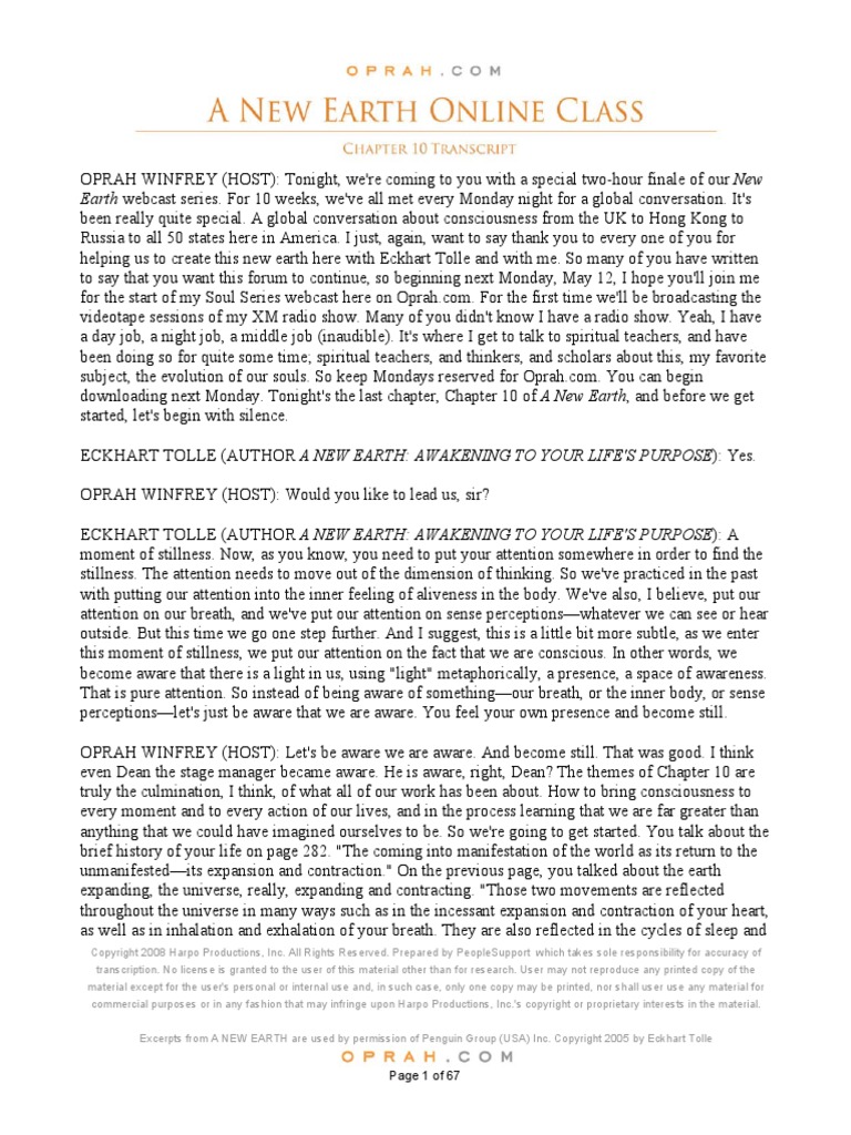 A New Earth Oprah Chapter1 Transcript Oprah Winfrey Spirituality