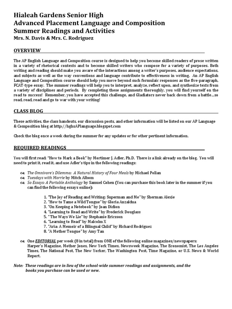Ap Language And Composition 2012 2013 Summer Assignment Pages