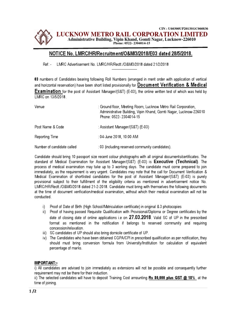 Official Notice Of Lmrc Result For Assistant Manager Test