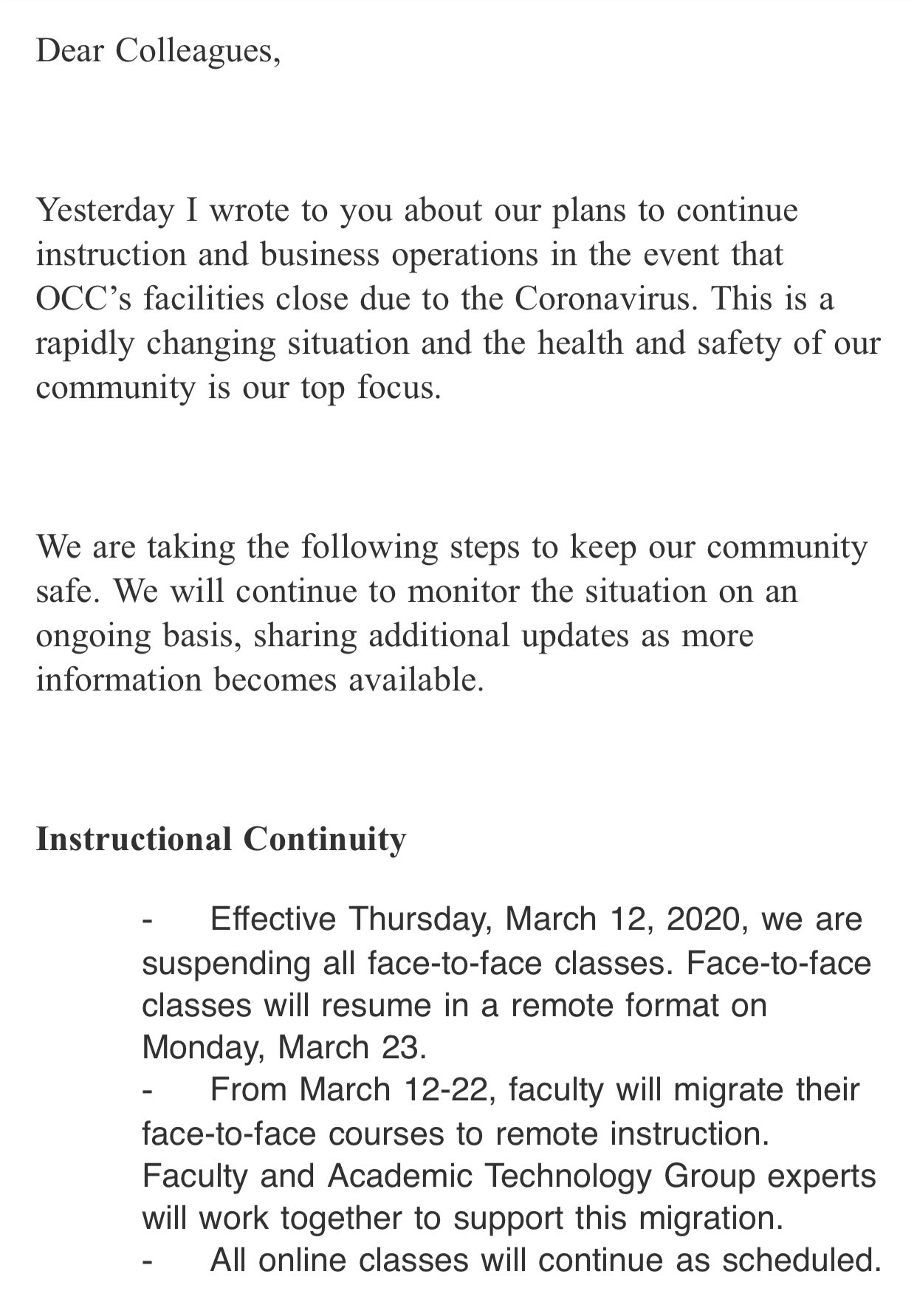 Occ Planning Combination Of In Person And Online Classes For Fall
