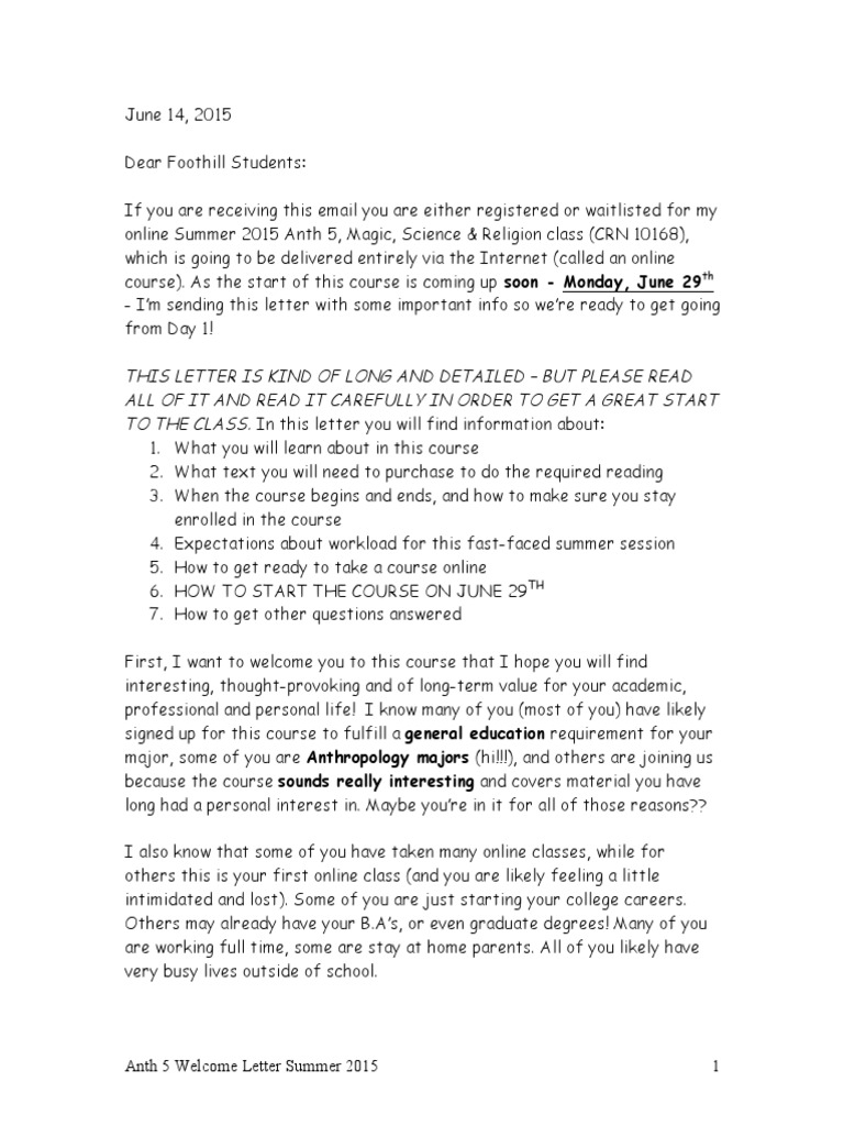 Welcome Letter Anth 5 Online Summer 2015 Magic Paranormal