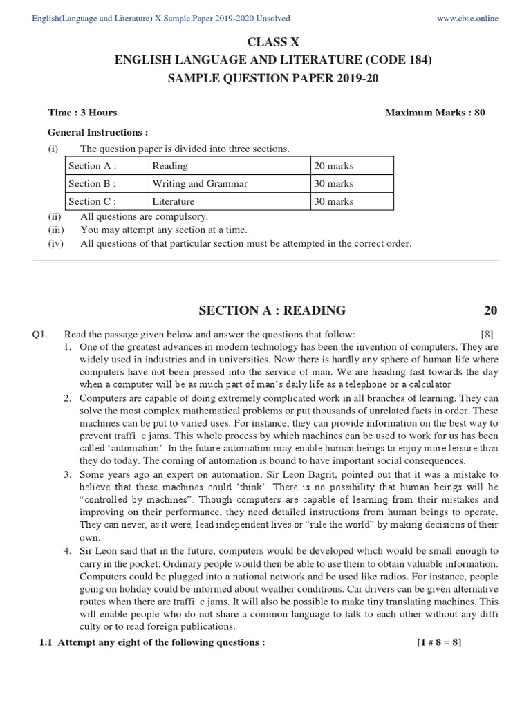 Cbse Sample Papers 2020 For Class 10 English Language And Literature Aglasem Schools